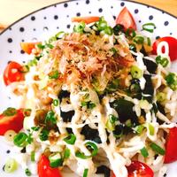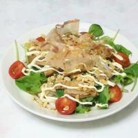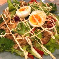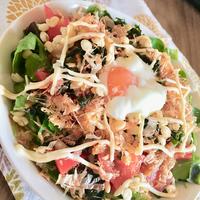 - 5 器に4を盛り、ベビーリーフ、1、汁気を切った3、あげ玉、乾燥わかめ、温泉卵をのせます。めんつゆをかけ、マヨネーズを絞り、かつお節を散らして完成です。
