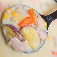 - 7 牛乳、コーンの水煮、(A)を入れて中火で加熱し、沸騰直前になったら火から下ろします。器に盛り付けトッピングをかけて完成です。