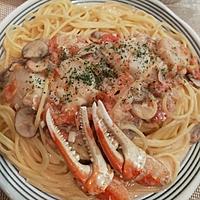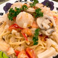 ホタテのデュグレレ風パスタのご紹介です。白ワインで蒸したホタテのうま味が生クリームとさわやかな酸味のトマト、ブラウンマッシュルームのうま味たっぷりのソースにスパゲティがよくからんでとてもおいしいですよ。お酒にも合いますのでおもてなしにも喜ばれます。ぜひ、お試しくださいね。