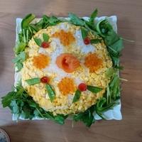 - 6 お皿に盛った5の上でサーモンをバラに形作り、小梅をバランス良くおいていきます。きゅうりは周りに置いていきます。さやえんどうがバラの葉に見えるようにサーモン、小梅、きゅうりに飾ります。いくら、三つ葉をケーキの周りに飾り付けて完成です。