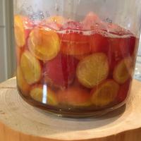 直売所で加工用ナポレオン(250g×2袋)を購入。種を"お茶パック"に入れ、グラニュー糖150g,レモン汁小さじ3杯で煮込みます。