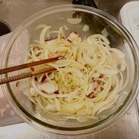 マリネ液にオニオンスライスと薄切りタコをさっと和えるだけの、簡単カルパッチョです。平らに盛り付けたタコに調味料をかけるカルパッチョも美味しいですが、和えてから盛り付けると味もなじみやすいのでおすすめですよ。ぜひ作ってみてくださいね。
