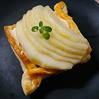 洋梨パイの作り方のご紹介です。洋梨のコンポートをのせて焼き上げました。コンポートは、電子レンジを使用して作りますので、とてもお手軽で簡単にできますよ。フィリングのクリームチーズもサクサクのパイと相性がよくおいしいですよ。