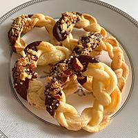 市販の冷凍パイシートで手軽に作れるサクサク食感のクッキーです。パイ生地を三つ編みにして焼き上げるだけの簡単レシピで、見た目も華やかなリース型に仕上がります。トッピングはストロベリーチョコやホワイトチョコ、グラニュー糖など好みで楽しめます。パリパリとした食感と甘さ控えめな味付けで、プレゼントにも最適です。パイ生地は冷えた状態で扱うとスムーズに作業できますよ。