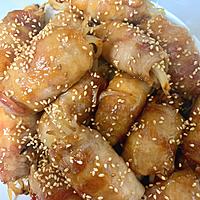 - 1 豚バラ肉にもやしをのせて巻き、片栗粉をまぶします。