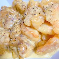 鶏もも肉も(別の衣で和えた)一緒に混ぜて食べ応え増やしました。