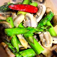 マッシュルームはエリンギやブナシメジでも代用可能です。 今回はアスパラガスの根元の部分を切っておりませんが、気になる方はカットしてから使用してください。 塩加減、辛さは、お好みで調整して下さい。