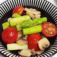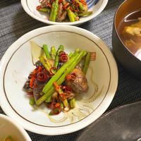 アスパラは短めにカットして食感を残すためレシピ動画より炒めすぎないようにして、彩りに余っていたミニトマトを加えました。