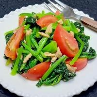ほうれん草とトマトのわさびドレッシング和えのご紹介です。ほうれん草の歯応えと、トマトの旨味が、わさびの風味が効いた酸味のあるドレッシングとよく合います。ツナも入れる事により、コクが増します。副菜の一品として、ぜひお試しくださいね。