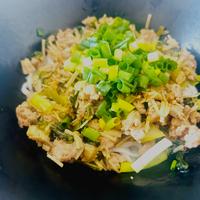 - 2 フライパンを中火で熱し、油をひかずに豚ひき肉を入れて炒めます。色が変わってきたら、1と(A)を入れて炒め合わせます。