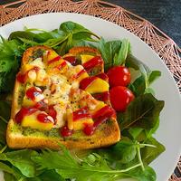 - 3 食パンに2を塗り、1を乗せてケチャップをかけ、ピザ用チーズをのせて、アルミホイルを敷いた天板にのせ、オーブントースターで5分ほどこんがり焼き目がつくまで焼きます。