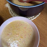 赤パプリカと黄色パプリカで♪すごくすごく美味しかったです(*´ω`*)牛乳を入れた後、あえて温めず!冷製スープでいただきました(*^-^*)