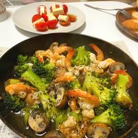 彩りのため、竹串で穴を開けたトマトとレンチンした冷凍ブロッコリーを足しました。ニンニク等を焦がさないように弱火で沸々と煮ると上手くできました。アンチョビの塩分があるので、塩は少なめでいいかも。きのこの旨みが出て美味しくできました^_^