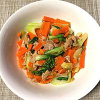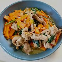 - 3 フライパンに、ごま油を熱し、しょうがを入れて香りが出てきたら、豚しゃぶ肉を入れ、青梗菜、ニンジンを炒めます。