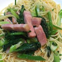 - 5 鍋にお湯を沸かして塩を加え、スパゲティをパッケージの表記通りにゆでます。スパゲティを取り出し、同じお湯に1を加えて30秒程ゆで、流水にさらし、粗熱が取れたら水気を絞ります。