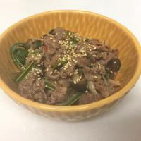 - 2 中火で熱したフライパンにごま油をひき、牛こま切れ肉を炒めます。