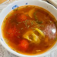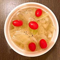 コンソメと塩胡椒のみなのでシンプルなスープでしたが美味しかった。煮込んだミニトマトは、柔らかく噛むと口一杯に酸味が広がり良いアクセント。また作ります!