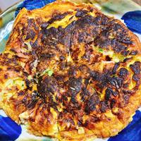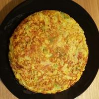 - 5 中火に熱したフライパンにオリーブオイルをひき、4を流し入れて中火で全体を大きくかき混ぜ、縁が少し固まって来たら蓋をして弱火で7分程、中に火が通るまで焼きます。
