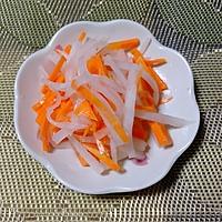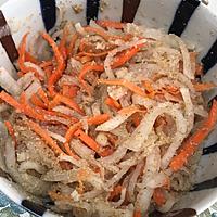 大根とにんじんの細切りはスライサーを使うと簡単にできます。 塩もみ後はしっかりと野菜の水気を切ってください。