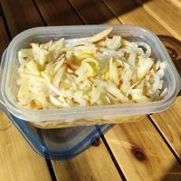 人参のかわりに大量にあるりんごで。すりごまは後から追加しました。なしでも美味しかったですが、ありだとごまの風味が追加されて酸味が少し抑えられ、より美味しかったです。柚子があったので皮をきざみ、実を少し絞り入れました。家族からも大好評でした。