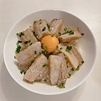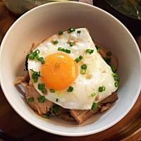 御飯の上にきざみ海苔。目玉焼き載せました☺️出汁醤油少々😋豚ロースで作りました。