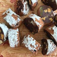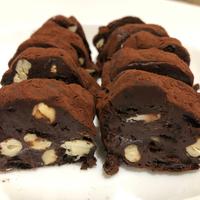 サラミのようなチョコレートです。今回はラムレーズンとナッツで大人の味にしましたが、マシュマロやオレンジピールを入れるなど、さまざまなアレンジができます。輪切りにして並べると、断面がきれいです。ぜひ作ってみてくださいね。