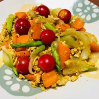 野菜は玉ねぎ、アスパラ、ミニトマト、にんじん。鶏ひき肉追加。調味料はレシピ通りでおいしく出来ました。