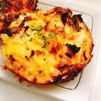 - 3 型に入れてピザ用チーズをのせ、200℃のオーブンで15分程火が通るまで加熱します。