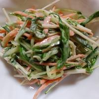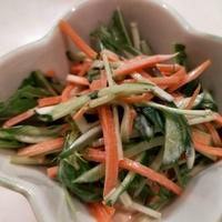 - 1 水菜は根元を切り落とし、3cm幅に切ります。にんじんは皮を剥いて千切りにし、きゅうりは千切りにします。