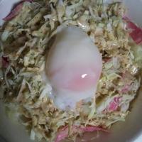 キャベツとハムのシンプルなサラダに温泉卵をのせて、シーザーサラダ風に仕上げました。とろっとした温泉卵を絡めて食べると、濃厚な味わいが楽しめますよ。時間のない朝や、さっと作りたい忙しい日にもぴったりです。ぜひお試しくださいね。