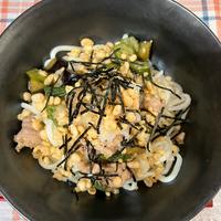 オクラ6本、ナス2本をレンチン。豚バラは鍋で別茹でしてから和えました。冷うどんの上にぶっかけて胡麻と大葉を散らして。味が物足りなかったのでごま油をさらっとかけたら美味しかったです。
