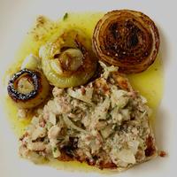 - 5 両面焼けたら上にアンチョビソースをかけます。玉ねぎに塩をふったら完成です。