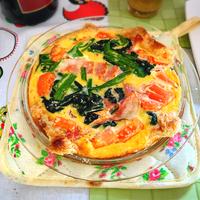 具はベーコン・ミニトマト・ほうれん草・ホワイトマッシュルーム、余った生地で星型パイ。卵液がなかなか固まらず焼き時間延長。パイの形が歪だけど重石なくても作れる✏️
