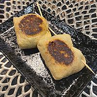 - 2 油揚げの上の部分を竹串でとめます。熱したフライパンに入れ、焼き色が付くまで弱火で焼き、火から下ろします。
