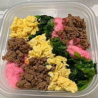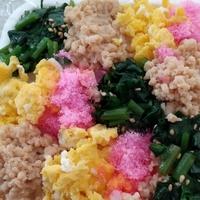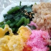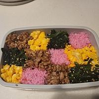 - 8 ごはんをお弁当箱につめ、2、5、7、桜でんぶを交互にモザイクになるように乗せたら完成です。