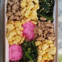 並べるのにとても頭を使いました😅ごはんにラインを引くようにあとをつけて具を乗せていくとそれっぽくできました。鶏そぼろがやや汁っぽくなってしまったせいか横にでんぶを置いてしまうとでんぷがお肉の汁をちょっと吸ってしまってた。まだ具がのこってるので次は配置を変えて作ってみたいです。