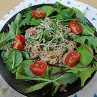 - 3 お皿に、2、ベビーリーフ、ミニトマトを盛りつけたら完成です。