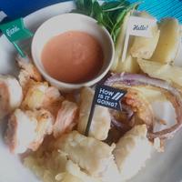 ぷりぷりっとした白身魚を、からりとフリッターに。しかも今回は、カレー味にアレンジしてみました! 外はサクサク、中はジューシーで美味しいですよ。 じゃがいもも一緒にあげてカレーフィッシュ&チップスにしても◎