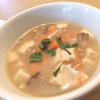 とろみがついた優しい味わいのスープは、豆腐やえのき、にんじん、玉ねぎなどの野菜がたっぷり入って体にも優しい一品です。具材は好みで変更可能で、コロコロ切りの食材が食べやすくスープに良く馴染みます。作り方も簡単で、2日目は味がさらに染み込んでより美味しくなるのが特徴。味付けは中華スープの素で手軽に作れ、お好みで味の濃さを調整できます。