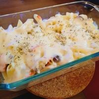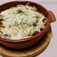 鮭としめじのパスタグラタンの紹介です。手作りホワイトソースで作るので、とってもお手軽ですよ。クリームパスタをチーズに絡めてお召し上がりください。ボリュームのある一品ですよ。今晩のメニューにいかがでしょうか。