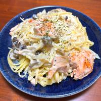 鮭と茸の相性が抜群で旨いのだがチーズの下でパスタが重たく食べ難かった。パスタを半分くらいに切って作ってみるのも良いかもしれない。