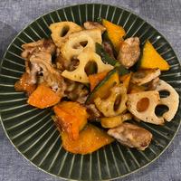 かぼちゃ、レンコン、にんじん、豚こま肉で作りました。