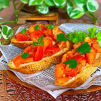 シンプルな調味料で味つけしたトマトサラダをフランスパンにのせていただく、お手軽フィンガーフードのご紹介です。ペッパーソースの辛みとみじん切りにしたニンニクがアクセントです。おもてなしやホームパーティにもおすすめですよ。