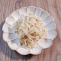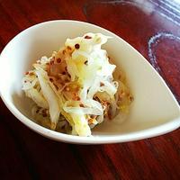 - 3 1の水気を切り、さきいかと一緒に2に入れて和えます。