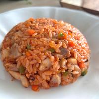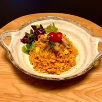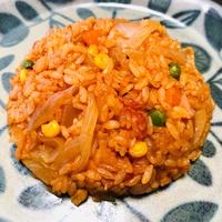 バターとケチャップの相性抜群な王道チキンライスです。鶏肉はゴロッと大きめに切るとジューシーな食感が楽しめます。具材は定番のミックスベジタブルの他、ピーマンやマッシュルーム、コーンなどお好みの野菜を加えてアレンジ自在。コンソメで深みのある味わいに仕上がり、ご飯は少し硬めに炊くのがポイントです。余りご飯でも手軽に作れる人気メニューです。