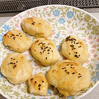 - 5 天板にクッキングシートを敷き、3をのせ卵黄を塗り、黒いりごまをトッピングして、200℃のオーブンで15~20分程ほんのり焼き色が付くまで焼きます。