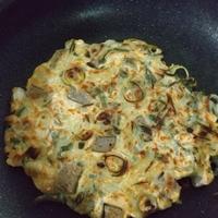 - 4 フライパンを中火で熱してごま油をひいてから、3をお玉ですくって入れます。 蓋をして表面が固まり、生地の周りがカリッとなるまで焼きます。