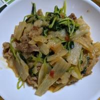 長芋、豚ロース薄切り肉、豆苗にしめじを足して。醤油を少し多目にして甜麺醤も加えて。長芋のホクホクとピリ甘辛の味が合って美味しかったです。