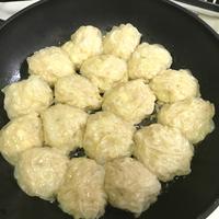 節約レシピでありがたいです。タネをフライパンに入れてから焼売の皮を被せると皮同士がくっついてしまうので、タネに皮を包んでから1個1個置いてみました。全く、くっ付かず裏はコンガリとジューシーに出来ました(o^^o)