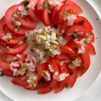 玉葱はさらすとドレッシングが水っぽくなるのでさらしません。時間がたてば辛味は失くなります。ケーパの代わりにピンクペッパー。旬のトマトが美味しいです✨